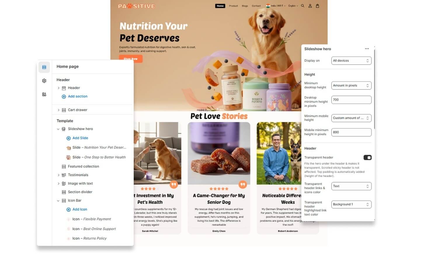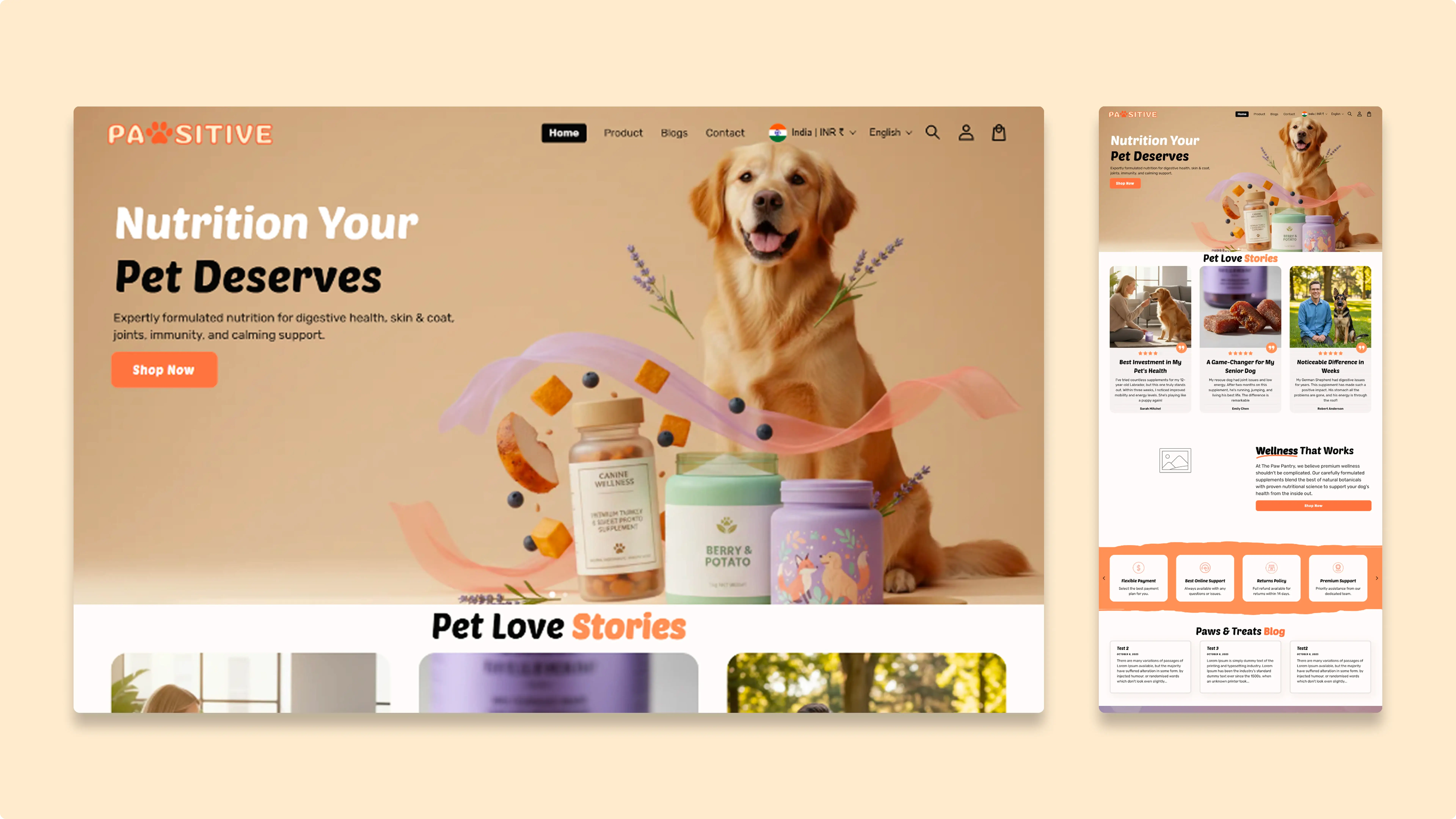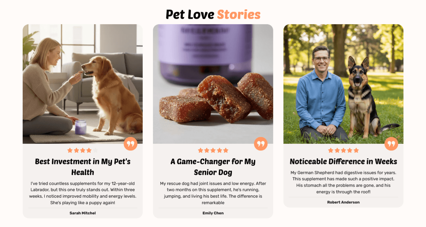 Bright, warm layouts built for pet brands with fast product discovery and conversion-focused upsells.